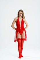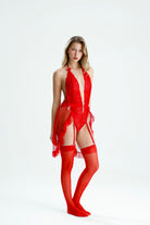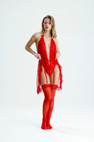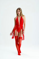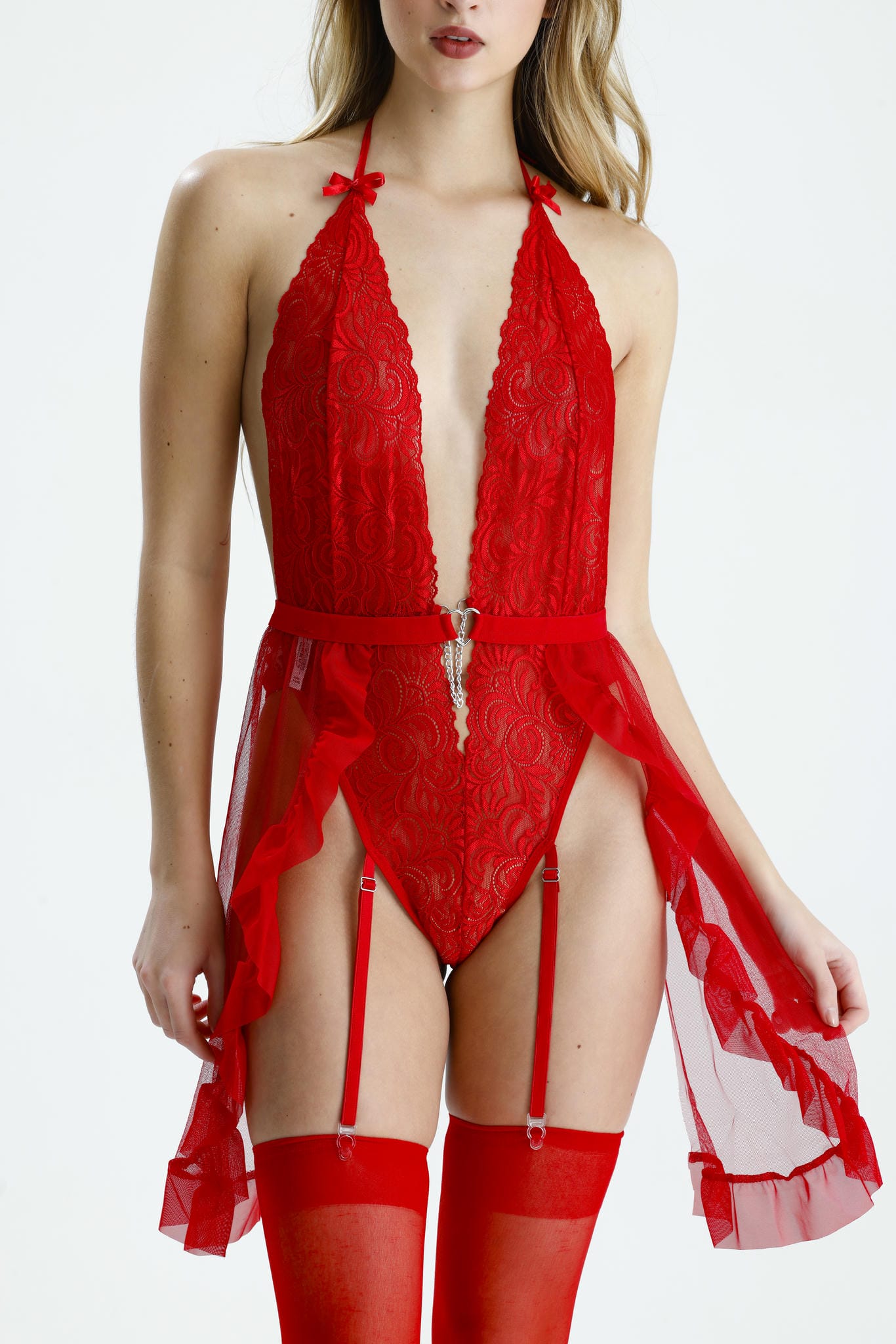 Ürün body formunda tasarlanmış jartiyer detaylı bir takımdır. Dantel ve transparan tül kumaş birlikte kullanılmıştır.Üst bölüm halter yaka formundadır ve boyundan bağlamalı yapıdadır. Ön kısım derin V kesime sahiptir. Gövde kısmı tamamen dantel kumaştan oluşur.