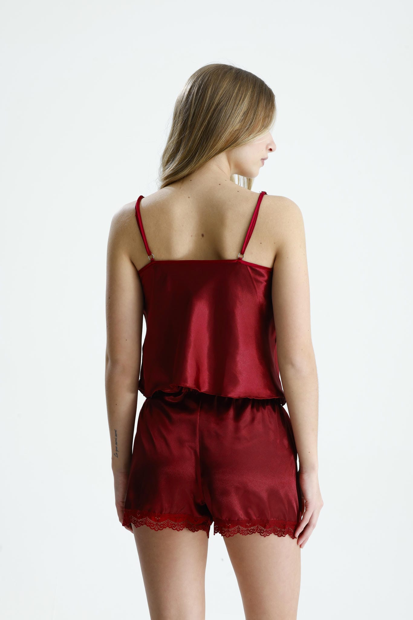 İki parçadan oluşan bu set; ince askılı üst ve lastikli şorttan oluşur. Parlak yüzeyli saten kumaş, pürüzsüz ve akışkan bir yapı sunar.